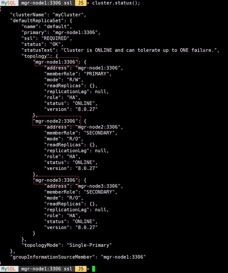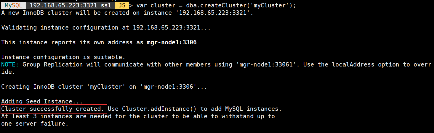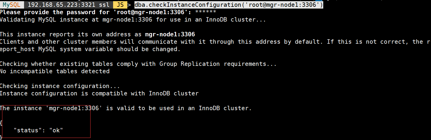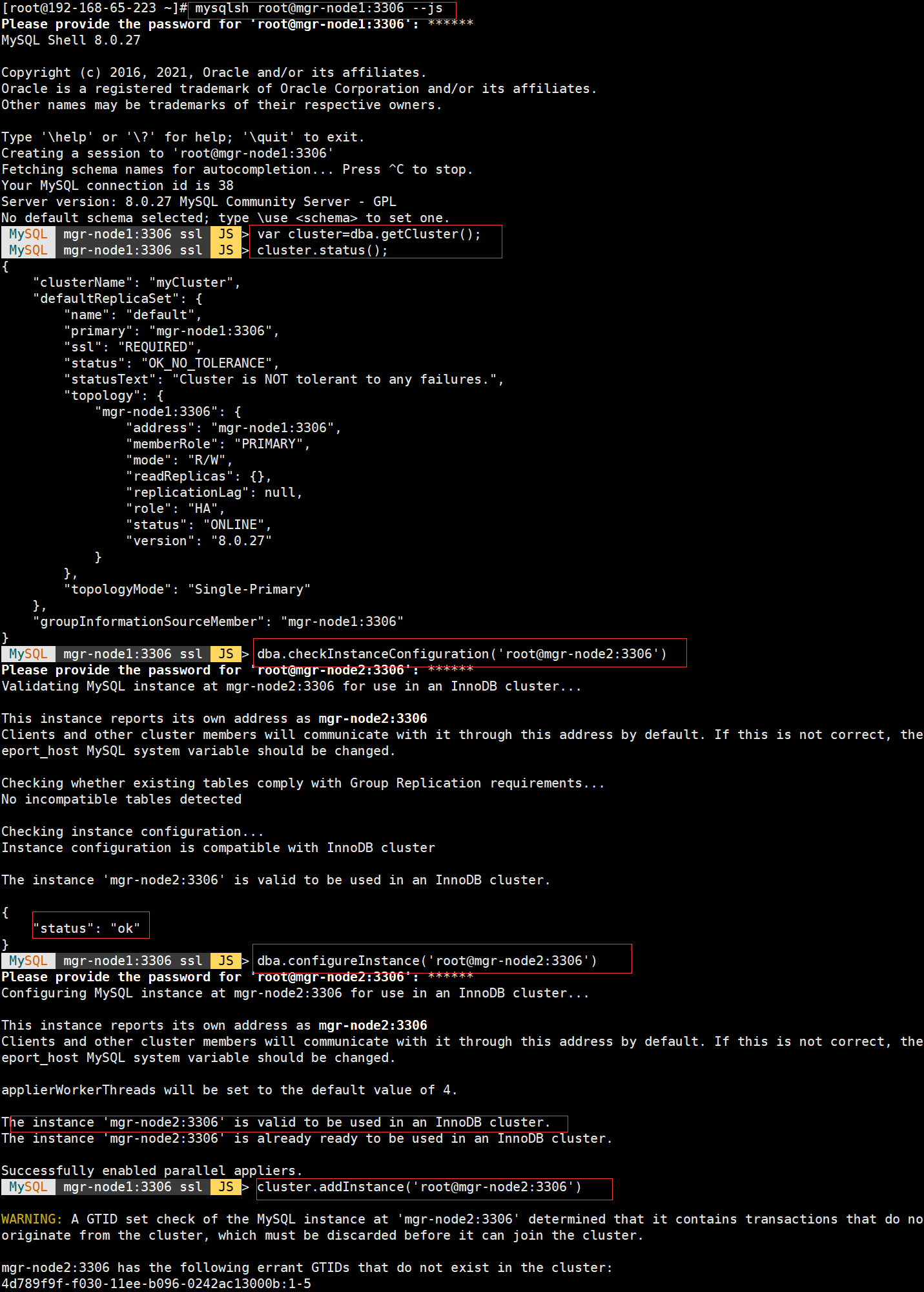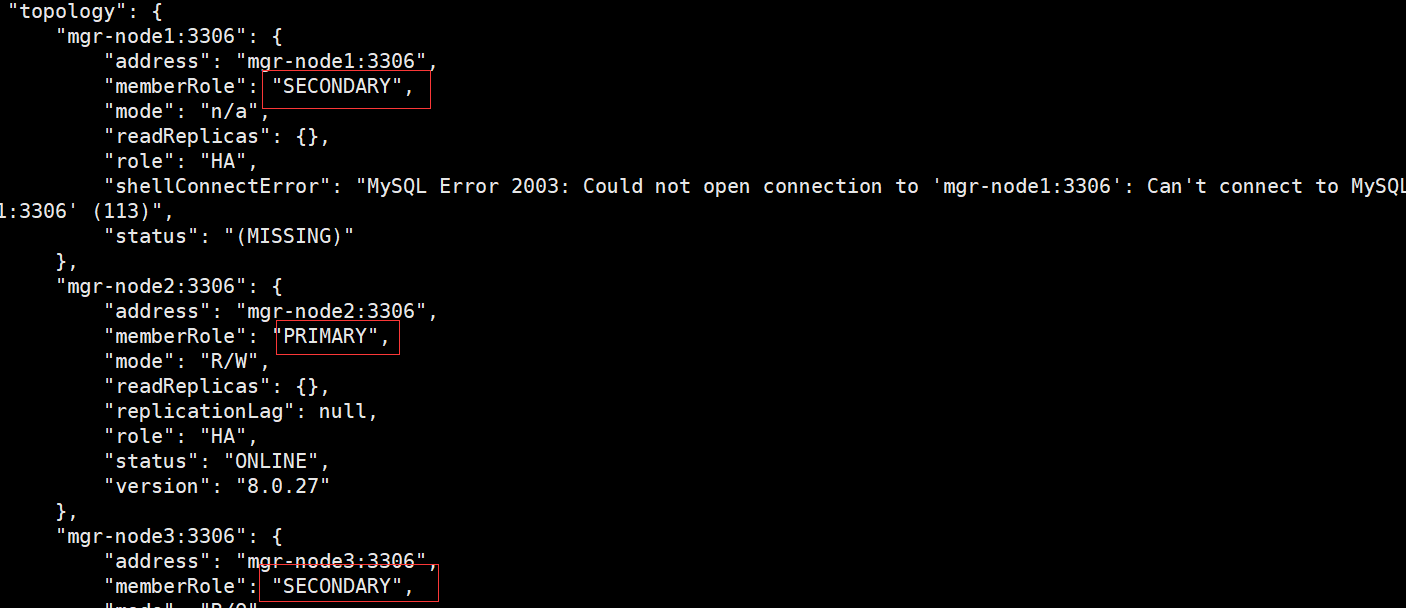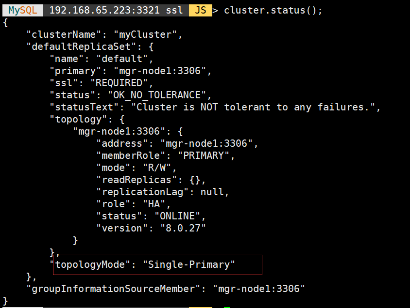 | mgr-node1(primary) | 1 | 192.168.65.223 | 172.19.0.10 | 3321>3306 |