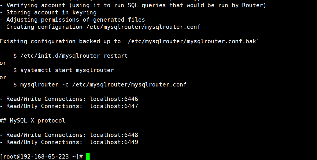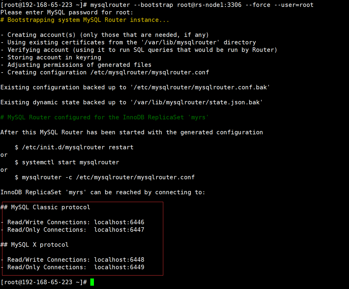 [root@192-168-65-223 ~]# mysqlrouter --bootstrap root@rs-node1:3306 --force --user=root