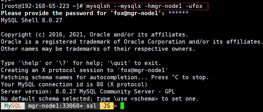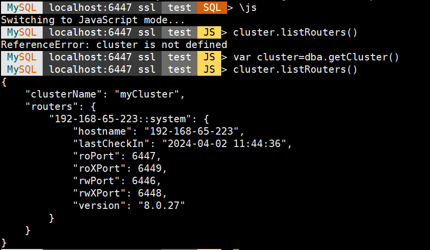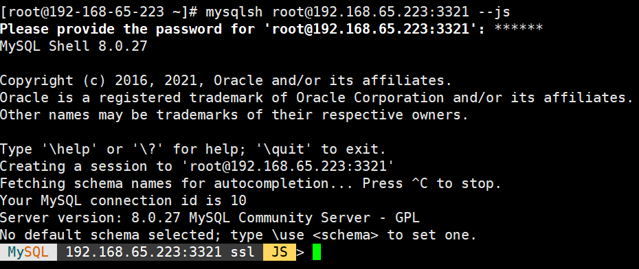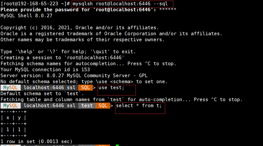[root@192-168-65-223 ~]# mysqlsh root@localhost:6446 --sql