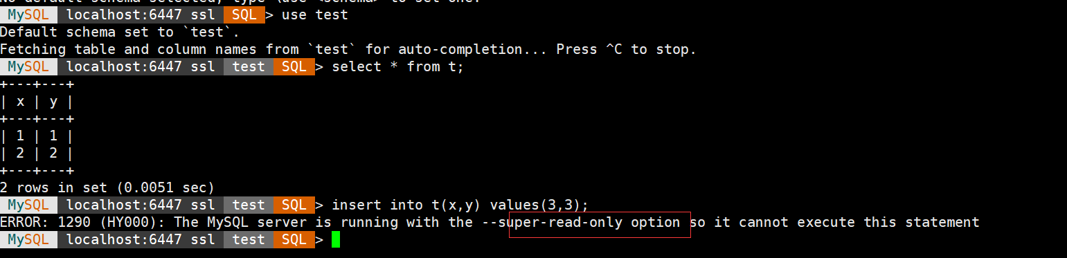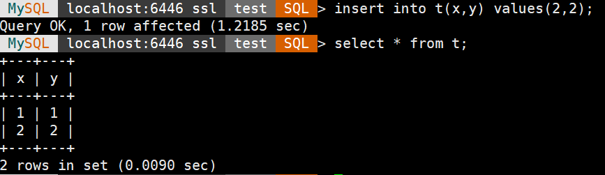MySQL localhost:6446 ssl test SQL > select * from t;
