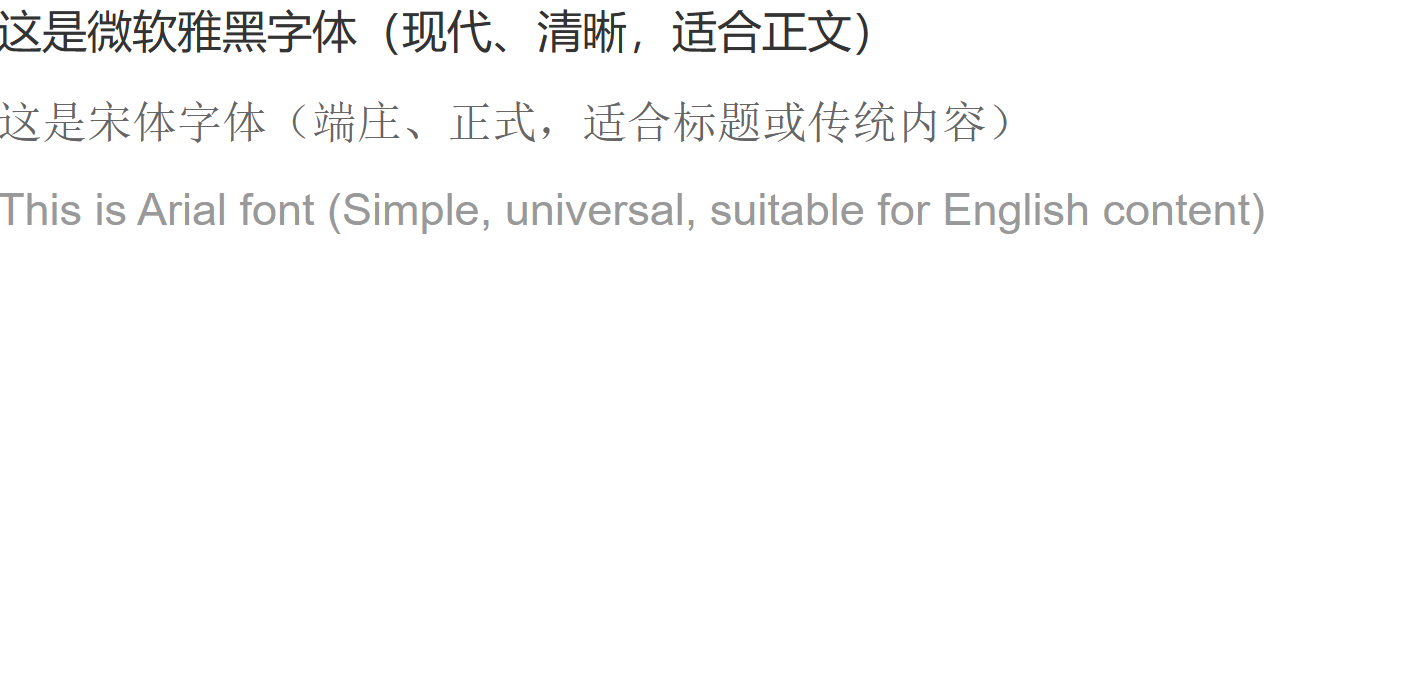 - 优先使用系统默认字体(无需额外引入,加载快、兼容性好),如 Windows 的 "微软雅黑"、Mac 的 "苹方";