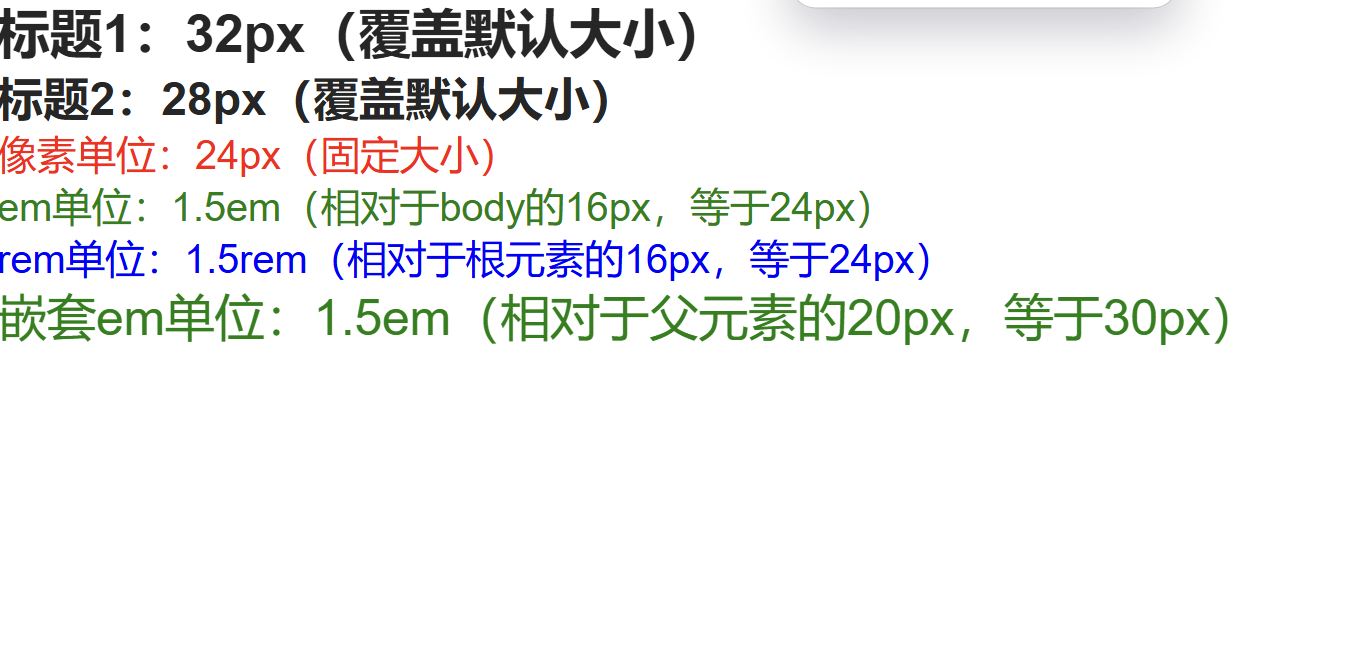 1.5em、150%):父元素计算出具体行高后,子元素继承这个具体值(如父元素font-size: 16px,line-height: 1.5em→ 父元素行高 =24px,子元素继承24px,无论子元素字体大小如何变化); - 推荐使用纯数值 (如