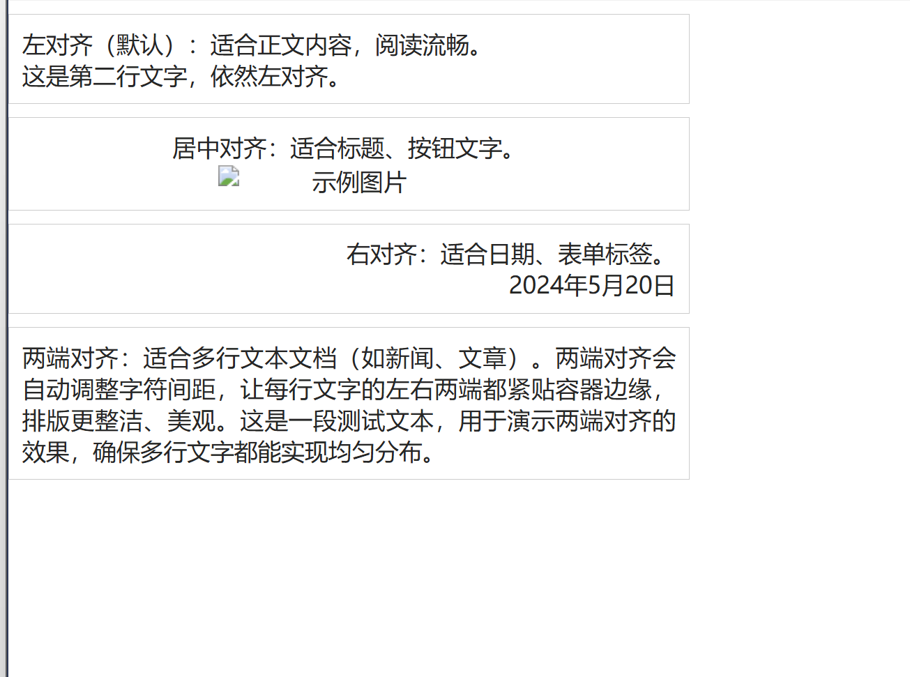 | text-align | 设置水平对齐 | left、center、right、justify | 作用于文字、行内元素,justify 仅对多行文有效 |