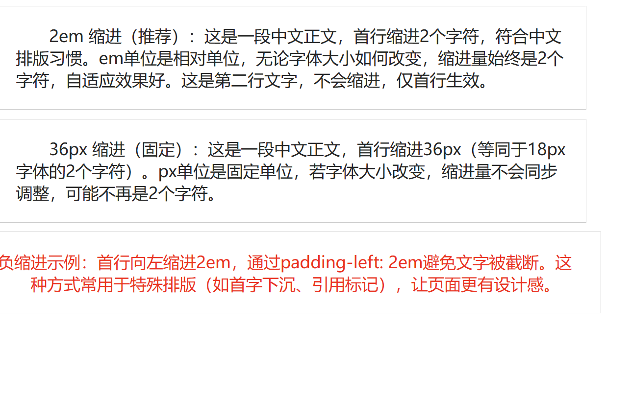 负缩进示例:首行向左缩进2em,通过padding-left: 2em避免文字被截断。这种方式常用于特殊排版(如首字下沉、引用标记),让页面更有设计感。