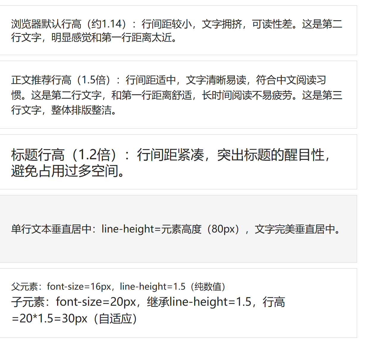 运行效果:line-height: 1.5 是正文最佳行高,line-height: 1.2 适合标题,line-height=元素高度 实现单行文本垂直居中,纯数值继承让子元素行高自适应。