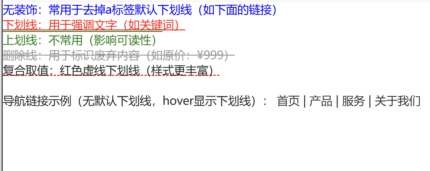 | text-decoration | 设置文本装饰 | none、underline、line-through | 常用於去掉 a 标签下划线,line-through 标识废弃内容 |