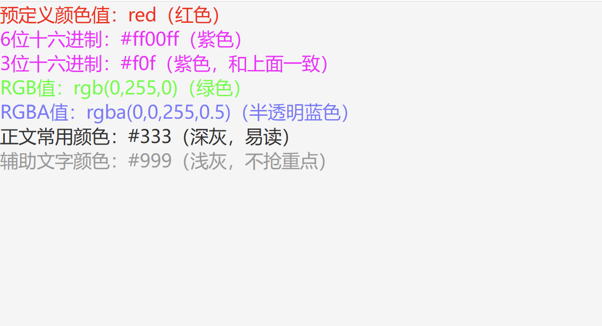 | color | 设置文本颜色 | 预定义值、十六进制、RGB/RGBA | 正文用 #333,辅助文字用 #999,RGBA 支持透明度 |