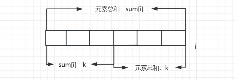 根据上图可以看出,只需要找到 i 前面有多少前缀和等于 sum[i] - k,就有多少以 i 为结尾并且元素总和为 k 的连续子数组。