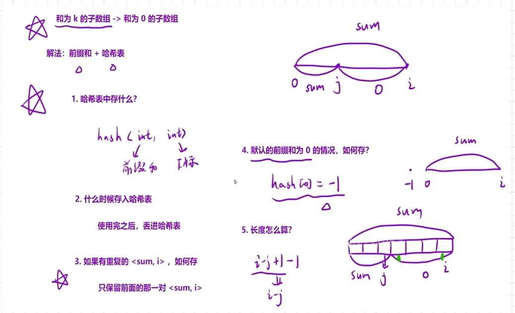 - 因为求的是满足条件的数组的最大长度,所以哈希表存储的是前缀和 和 下标的映射,下标是为了方便数组长度的计算。