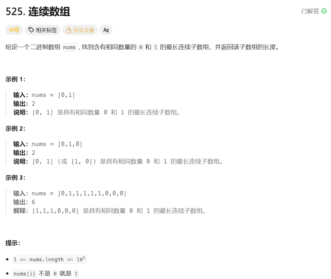 **思路:**将数组中所有的 0 都修改为-1, 这道题就转化为了在数组中,找出最长的子数组,使子数组中所有元素和为 0,与和为 k 的子数组那道题思路类似,只不过 k 固定为 0,并且求的是数组长度而不是个数。