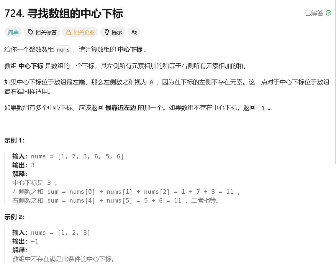 - 比较前缀和数组和后缀和数组中哪个位置的值相等,哪个位置就是中心下标。