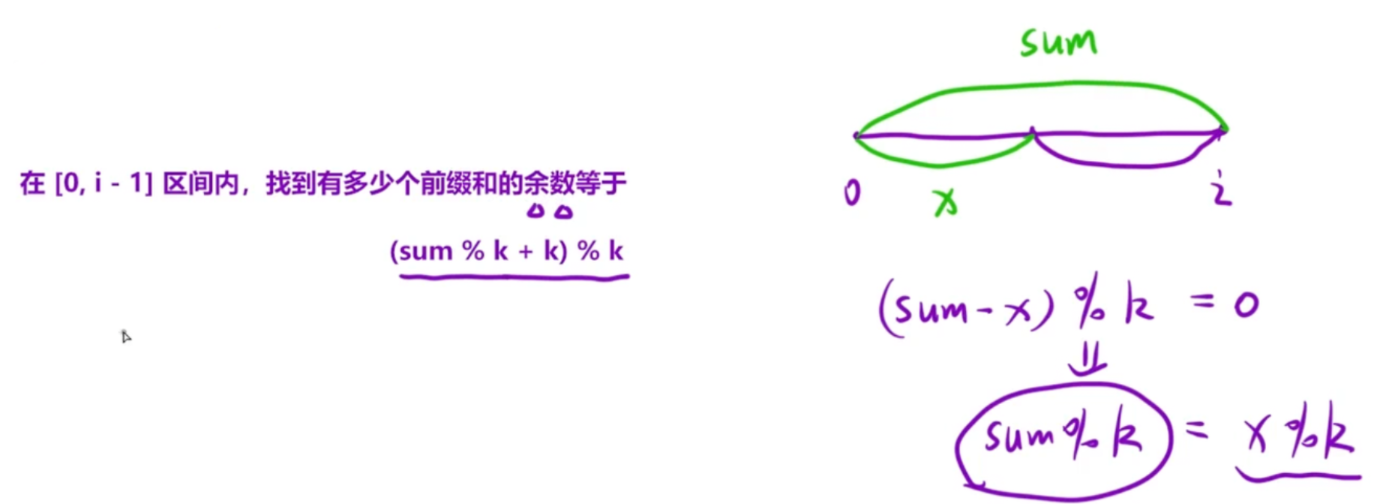 根据上图所示,我们要找 i 位置为结尾的子数组中有多少元素之和能被 k 整除,其实就是找 i 前面有多少前缀和与 sum 取模 k 后同余。为了快速找到 i 前面有多少前缀和与 sum 同余,我们使用哈希表存储 i 位置前面所有前缀和取模 k 后的余数和这个余数个数的映射即可解决问题。这道题的思路和上一道题类似,只不过还需要用到同余定理和负数取模之后的修正。