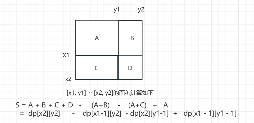 ret[i][j] = dp[x2][y2] - dp[x1 - 1][y2] - dp[x2][y1 - 1] + dp[x1 - 1][y1 - 1];