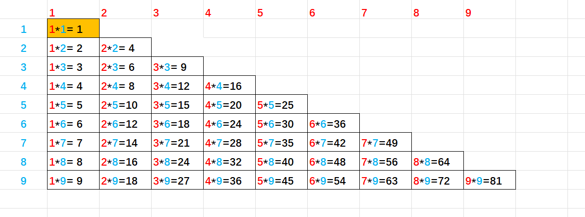printf("%d*%d=%2d ", j, i, i * j);