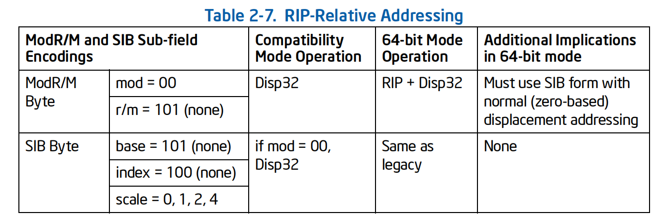 表 2-7 列出了 RIP 相对寻址 所使用的