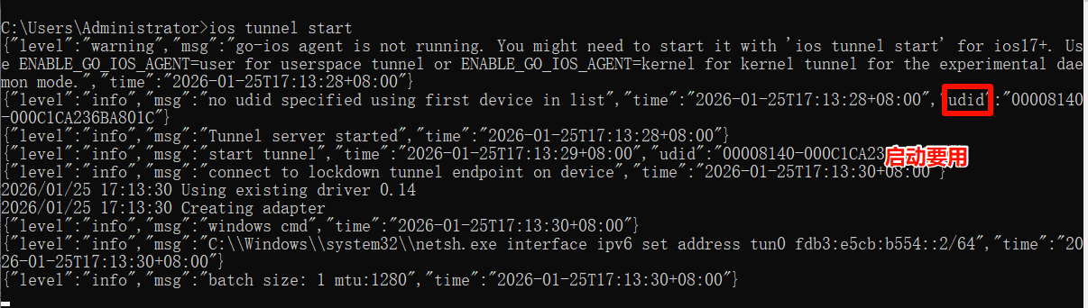 (1)以管理员身份打开终端,执行命令启动隧道:ios tunnel start(打开之后不要关闭该窗口)
