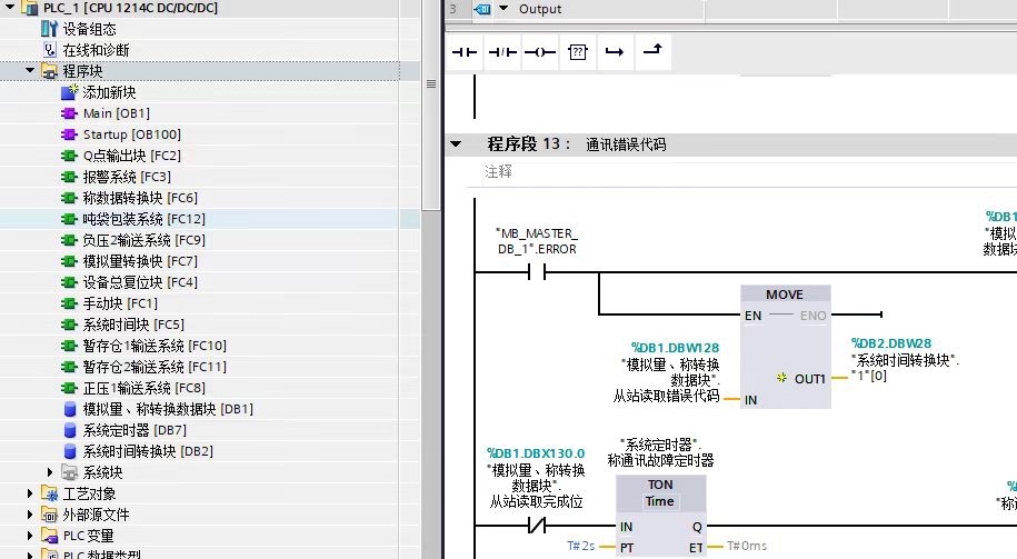 西门子PLC200Smart通过Modbus RTU协议与托利多FCW称重仪表通讯。下面咱看段关键代码(以梯形图为例):