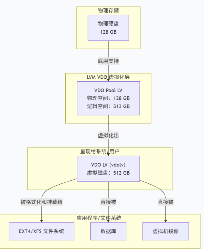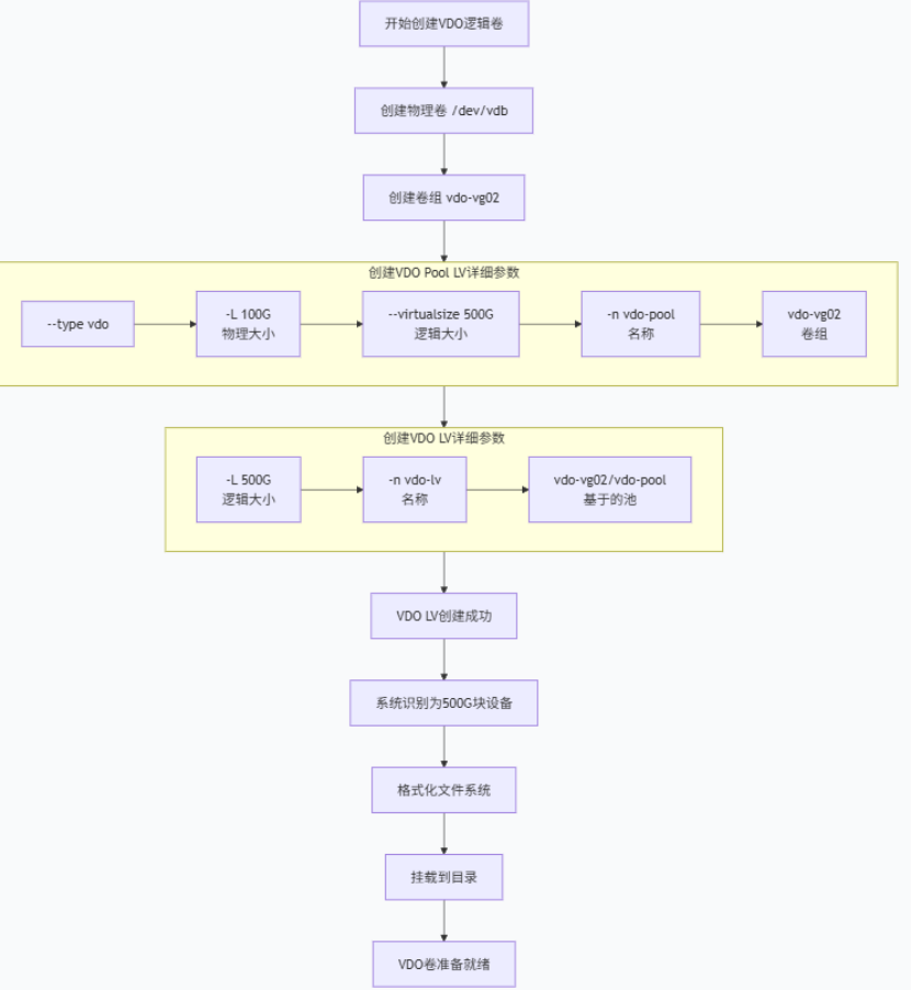 | 创建 VDO Pool | lvcreate --type vdo -L 100G --virtualsize 500G -n vdo-pool vdo-vg02 |