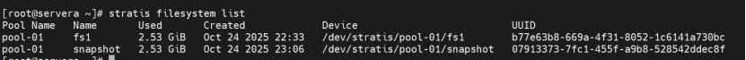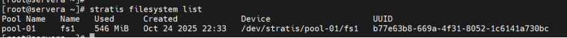 | 创建文件系统 | stratis filesystem create pool-01 fs1 |