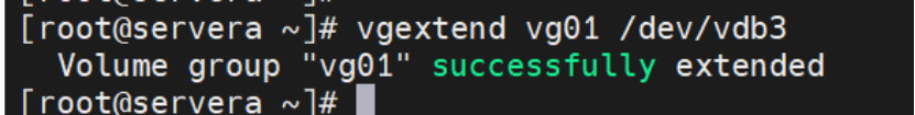 | 扩展 VG | vgextend vg01 /dev/vdb3 |