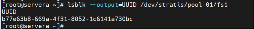 lsblk --output=UUID /dev/stratis/pool-01/fs1