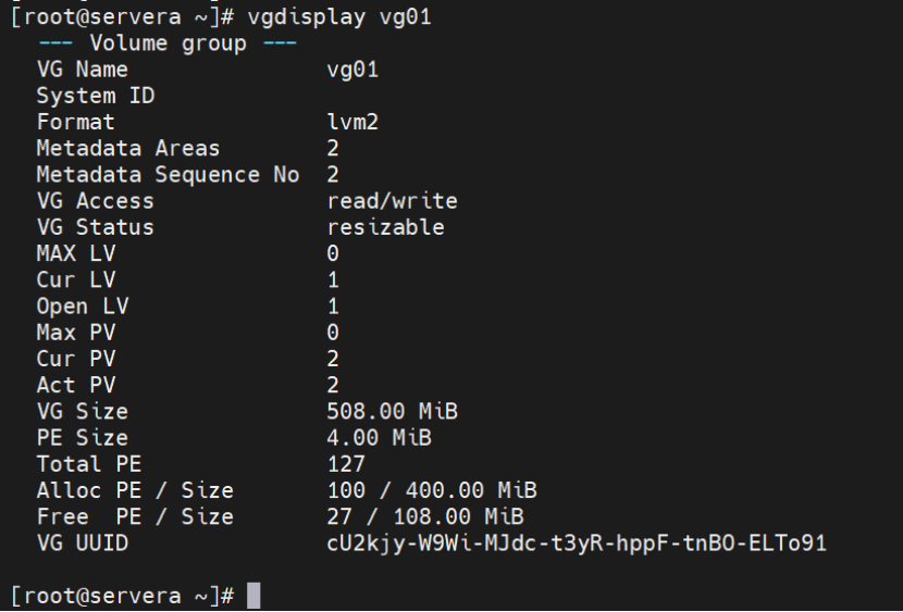 | Free PE / Size | 空闲 PE / 容量:27 / 108.00 MiB→ 剩余 108MiB(与/dev/vdb2的空闲 PE 一致) |