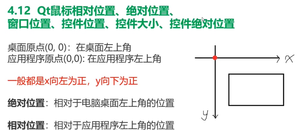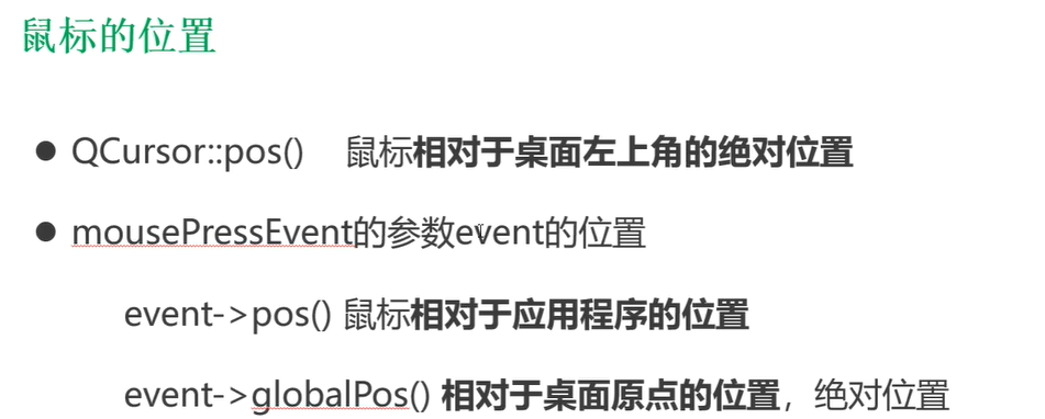 qDebug() << "mouse juedui position:" << QCursor::pos(); //鼠标绝对位置:相对于桌面左上角原点位置