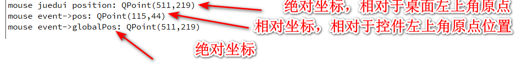 qDebug() << "mouse event->pos:" << event->pos(); //相对位置:相对于控件左上角原点位置