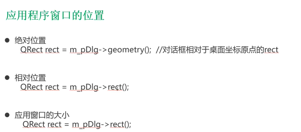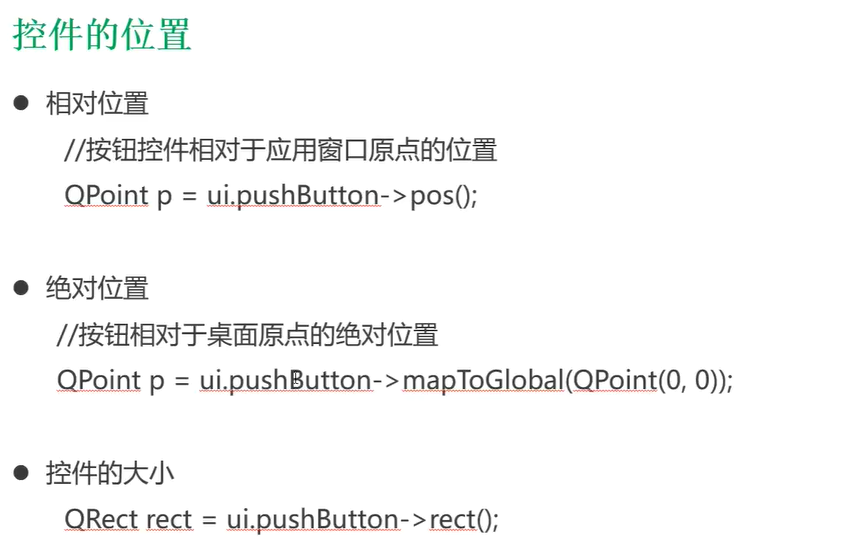 qDebug() << "btn postion:" << ui->pushButton->pos(); //相对位置,按钮控件相对于应用窗口原点位置