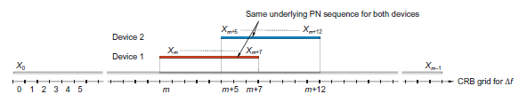 该序列会在所有公共资源块(CRB)上生成,但仅在实际传输数据的资源块上发送。这种设计确保在多用户MIMO场景中(如上图所示),当多个设备共享时频资源时,它们能使用相同的基础序列(实际实现中会在伪随机序列基础上叠加正交序列来生成多个正交参考信号)。若共调度设备采用不同的基础伪随机序列,将破坏参考信号的正交性。