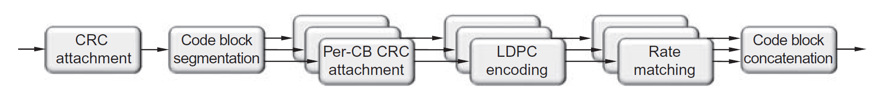 下图概述了信道编码的基本流程,具体细节将在后续展开说明。该流程主要包括以下步骤:首先为传输块添加CRC校验码用于差错检测,接着进行码块分割。随后对每个分割后的码块分别执行LDPC编码和速率匹配操作,其中速率匹配包含物理层混合ARQ处理。最终将所有处理完成的比特序列串联,形成完整的编码后传输块比特流。