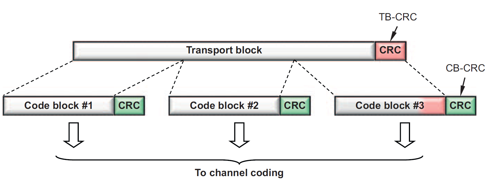 在物理层处理的第一步,会为每个传输块计算并附加循环冗余校验码(CRC)。该CRC可用于接收端检测解码后传输块中的错误,例如可被混合自动重传请求协议用作触发重传请求的依据。