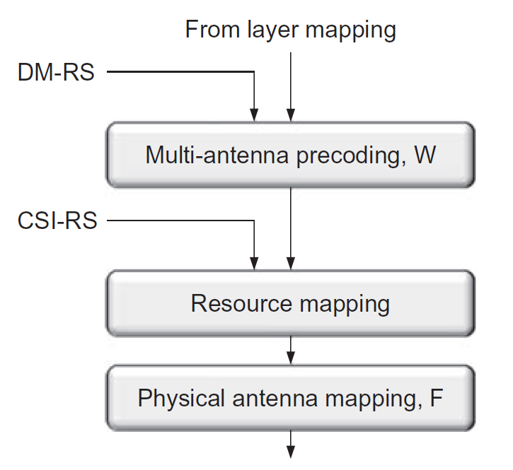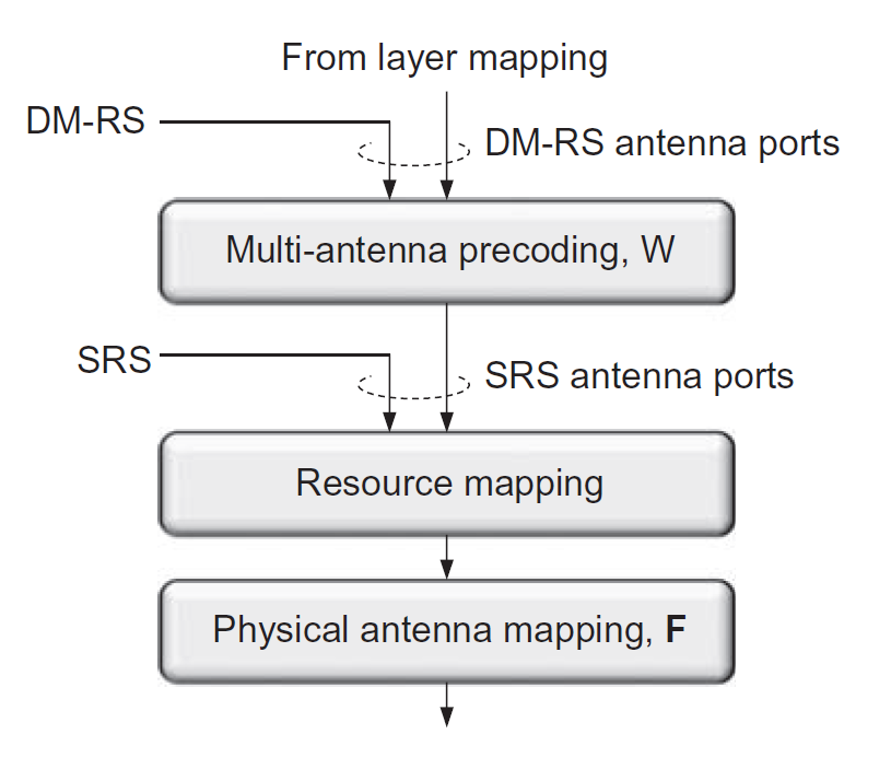 在下行链路传输过程中,解调参考信号(DMRS)与PDSCH采用相同的预编码处理(如下图所示)。这意味着接收端无法单独观测预编码操作,而是将其视为整体信道响应的一部分。实际上,从终端设备的角度来看,所有下行链路的多天线预编码都可归为这类透明空间滤波的范畴。