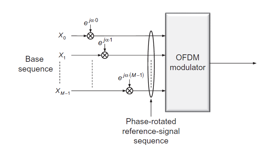 为获得均匀的信道估计质量,上行参考信号需保持较小的频域功率波动。常规OFDM采用伪随机序列来实现这一目标,而DFT预编码OFDM还需兼顾时域功率波动的约束以维持低立方度量。此外,参考信号序列需要具备足够数量,以支持多小区多设备调度需求。Zadoff-Chu序列完美契合这些要求:通过在频域施加不同线性相位旋转(如上图所示),可基于特定组索引和序列索引派生出多个参考信号序列。这一机制与LTE系统保持兼容,确保了设计的延续性。