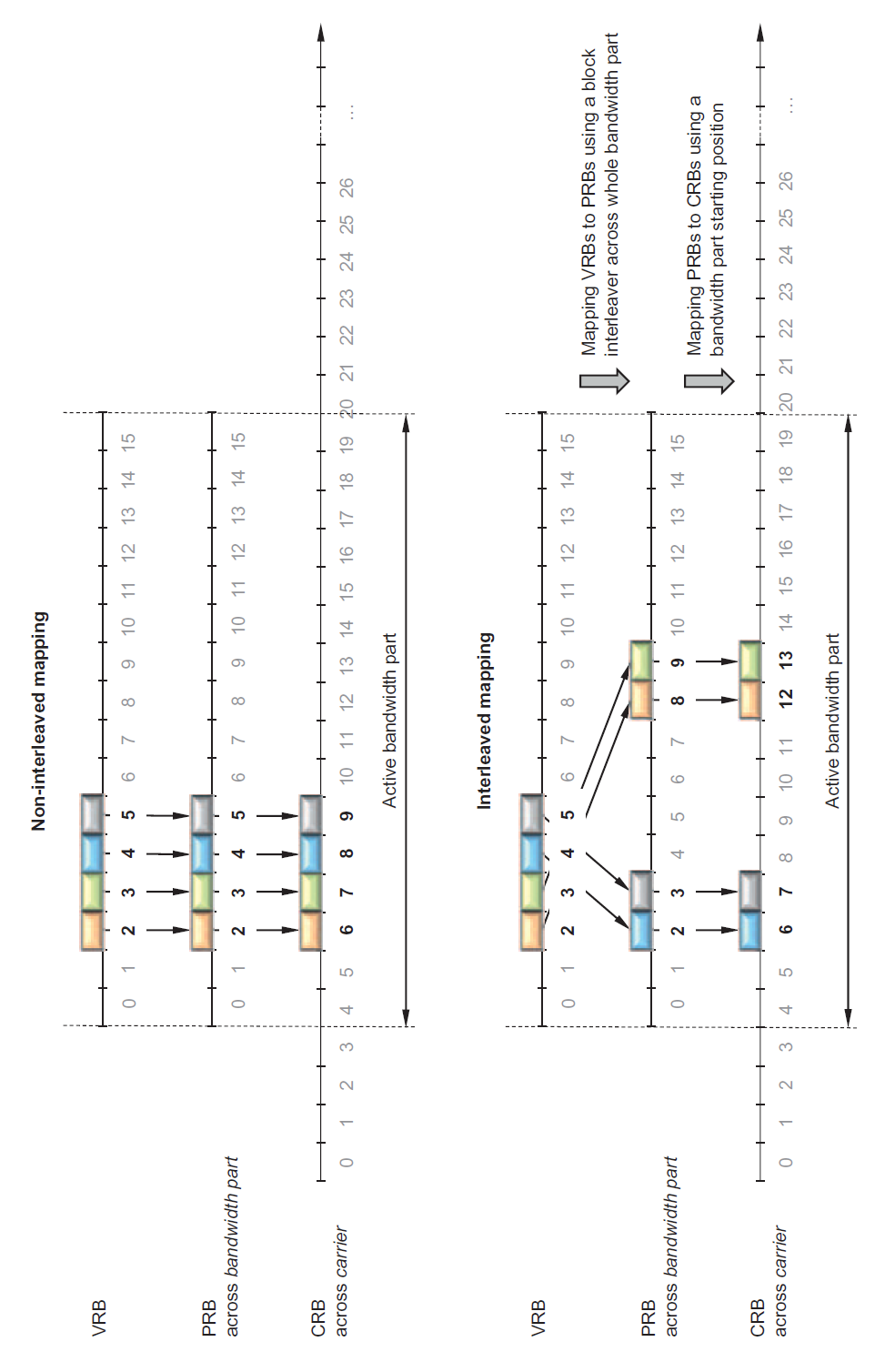 - 非交织映射(上图上部):直接将带宽部分中的虚拟资源块映射到同带宽部分的物理资源块,适用于需要根据瞬时信道条件优选物理资源的场景。