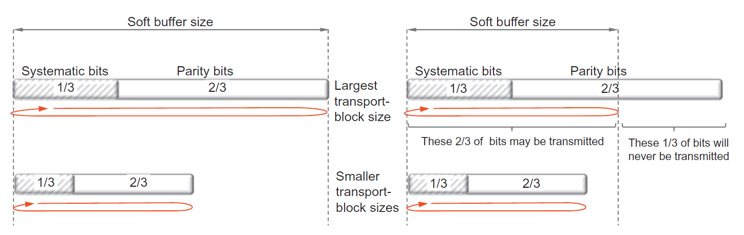 考虑到软缓存资源利用率,系统采用上图所示的有限缓存速率匹配机制:循环缓冲区仅保留接收端可缓存的比特量,其容量由设备软缓存能力决定。对于下行链路,设备只需缓存码率不超过2/3的最大传输块对应的软比特。该限制仅适用于最大传输块,较小传输块仍可缓存母码率的所有软比特。
