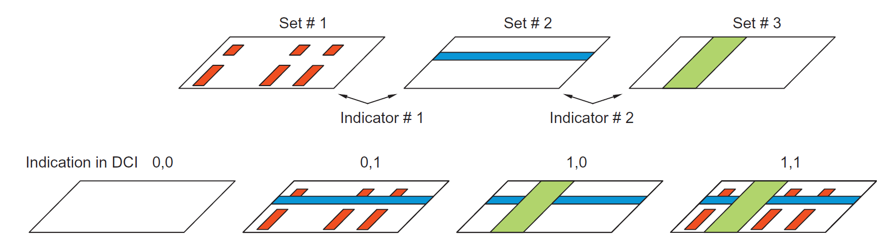 虽然最多支持8个可动态激活的资源集配置,但调度分配中仅包含2个指示符。每个动态资源集需分配到其中一个或两个指示符组,同组资源集将同时被激活/去激活。上图展示了三个资源集的分配示例(注:该示例仅为说明用途,并非实际部署场景)。