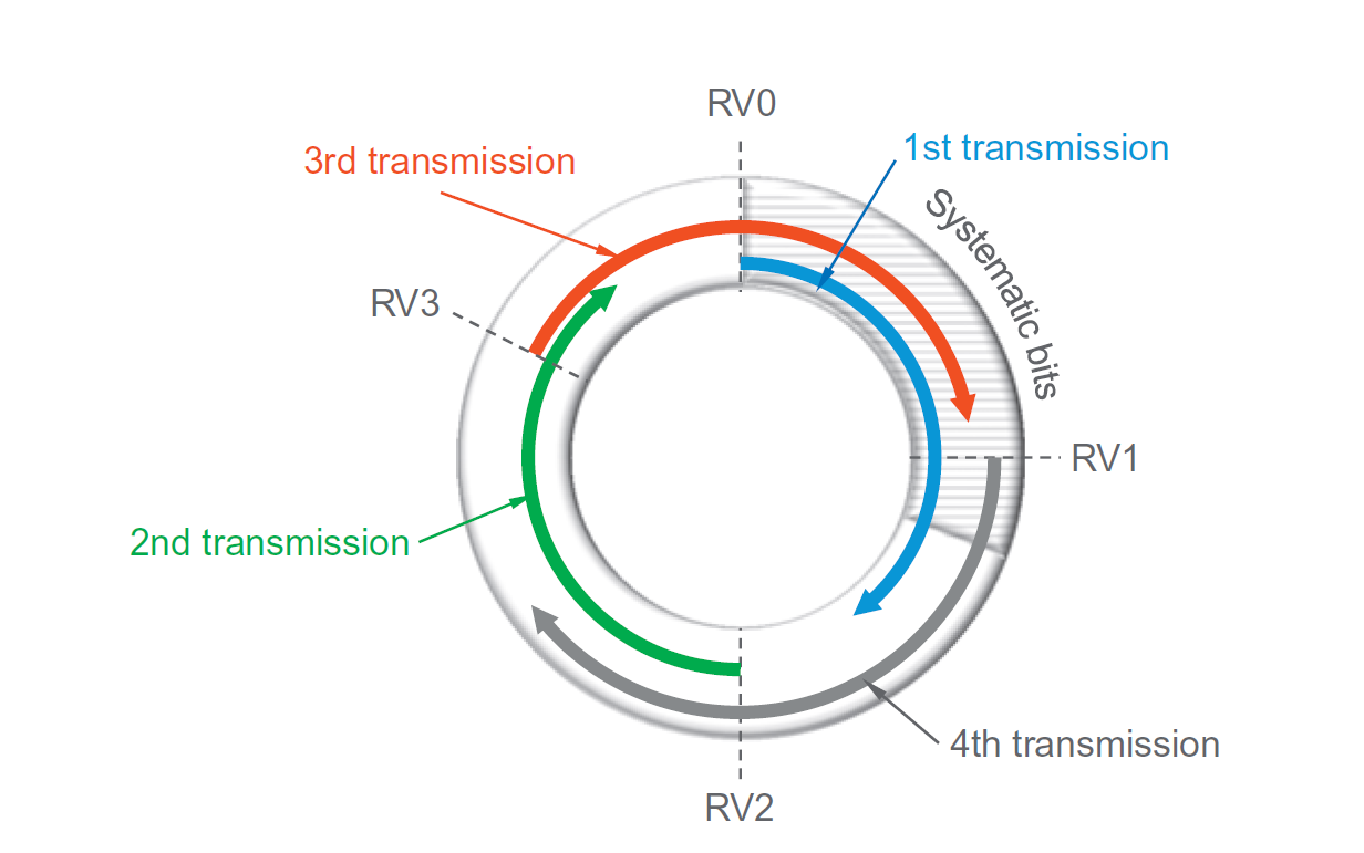 速率匹配以代码块为单位独立执行。处理时首先对固定数量的系统比特进行删余,删余比例最高可达系统比特的1/3(具体取决于代码块大小)。随后按下图所示顺序将剩余编码比特写入环形缓冲区:先写入保留的系统比特,再接入校验比特。传输时从环形缓冲区特定起始位置读取比特,不同冗余版本(RV)对应不同的起始位置。通过选择不同RV,可生成代表相同信息的不同编码比特集,实现增量冗余的混合ARQ机制。环形缓冲区的起始点设计确保RV0和RV3都具有自解码能力(通常包含系统比特),这也解释了下图中RV3位于"九点钟方向"的布局,该设计能使传输包含更多系统比特。