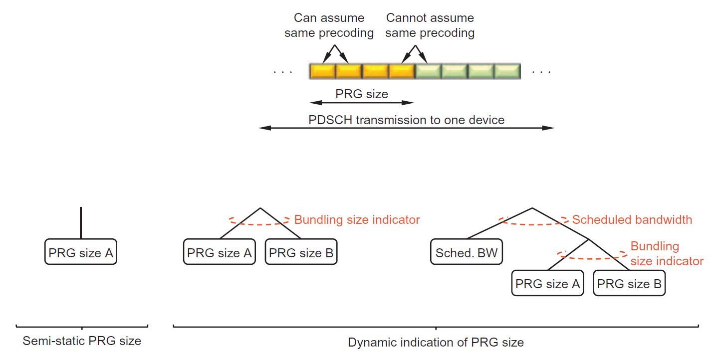 这表明预编码灵活性与信道估计性能之间存在权衡关系------较大的PRG尺寸能提升信道估计精度,但会降低预编码灵活性,反之亦然。因此,gNB可为设备配置PRG尺寸,可选值包括:2个资源块、4个资源块或整个调度带宽(如下图底部所示)。配置方式包括: