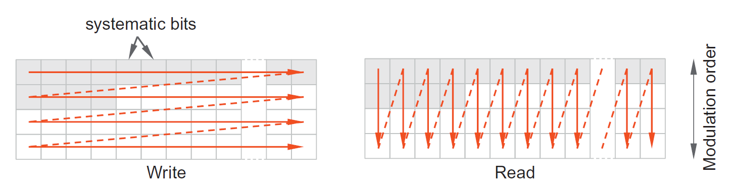 速率匹配的最后步骤是比特交织和码块级联。循环缓冲区的比特按行写入块交织器后按列读出,交织器行数由调制阶数决定,确保每列比特对应一个调制符号(见上图)。这种设计使系统比特均匀分布于各调制符号,提高传输性能。最后将所有码块的比特进行级联输出。