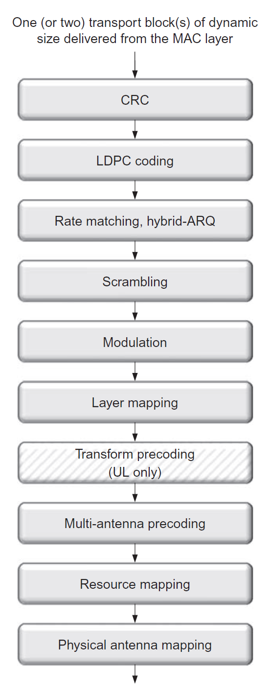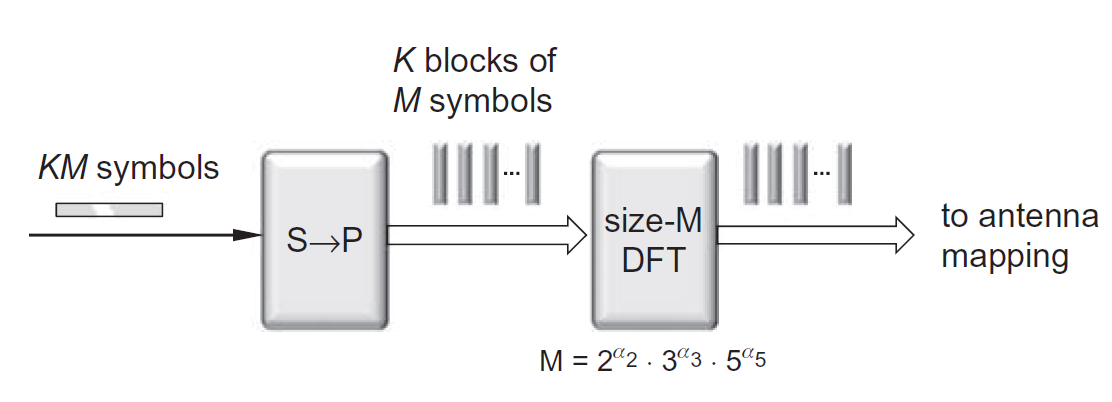 DFT预编码仅在上行链路中可配置。对于下行链路以及采用OFDM的上行链路传输,该处理步骤是透明的。