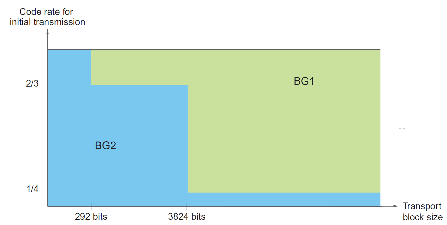 NR标准采用了具有双对角结构的准循环LDPC码。这种结构的校验矩阵核部呈双对角排列,使解码复杂度与编码比特数呈线性关系,同时简化了编码操作。标准定义了两个基图(BG1和BG2)来适应不同场景需求: