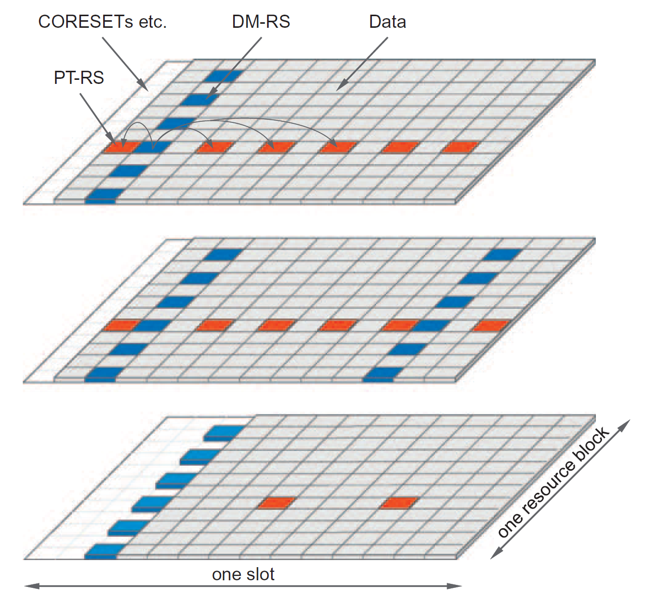 - 相位跟踪参考信号(PT-RS):作为DM-RS的补充扩展,主要用于相位噪声补偿。其时间密度高于DM-RS但频率密度较低,且必须与DM-RS配合使用。