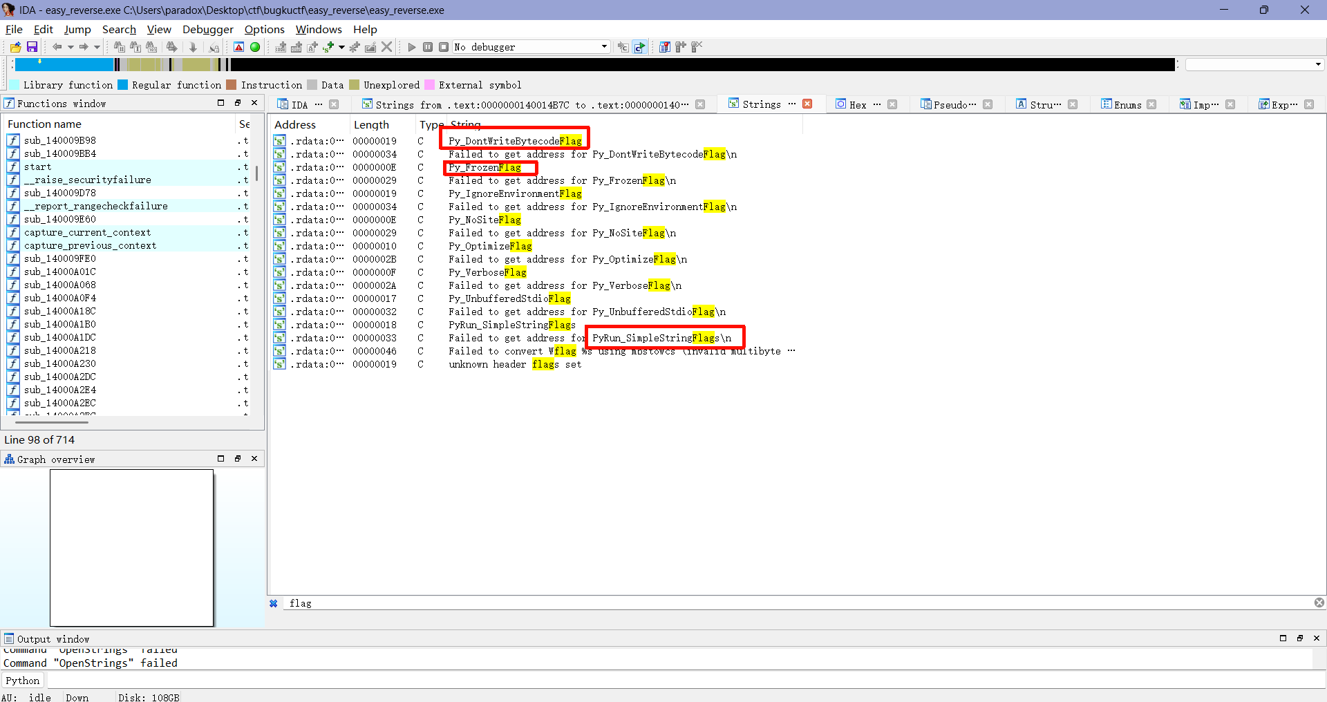 第一步shift + f12搜 flag 看看有没有什么线索,分析后发现这是一个python打包的 exe (使用工具如pyinstaller将python脚本打包成可执行文件),因为图中的那些字符串都是python解释器的内部标志和函数。
