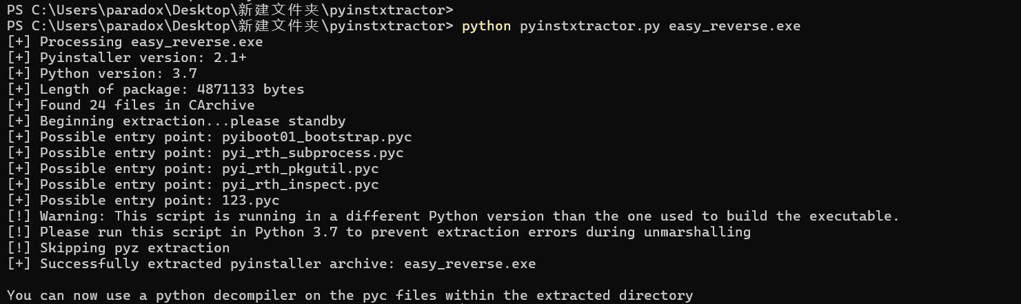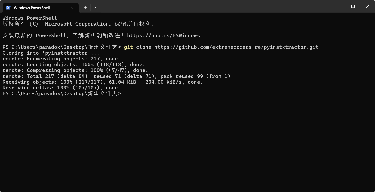 于是决定转换方向,下一步使用 pyinstxtractor 对附件中的exe文件进行解包,当前操作适用于没有下载到 pyinstxtractor ,随便找个文件夹,在里面打开 powershell