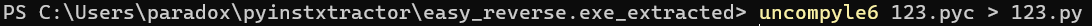 用 uncompyle6 来反编译 .pyc 文件为 .py 文件,目前操作为,没有安装 uncompyle6 的操作,使用powershell执行: