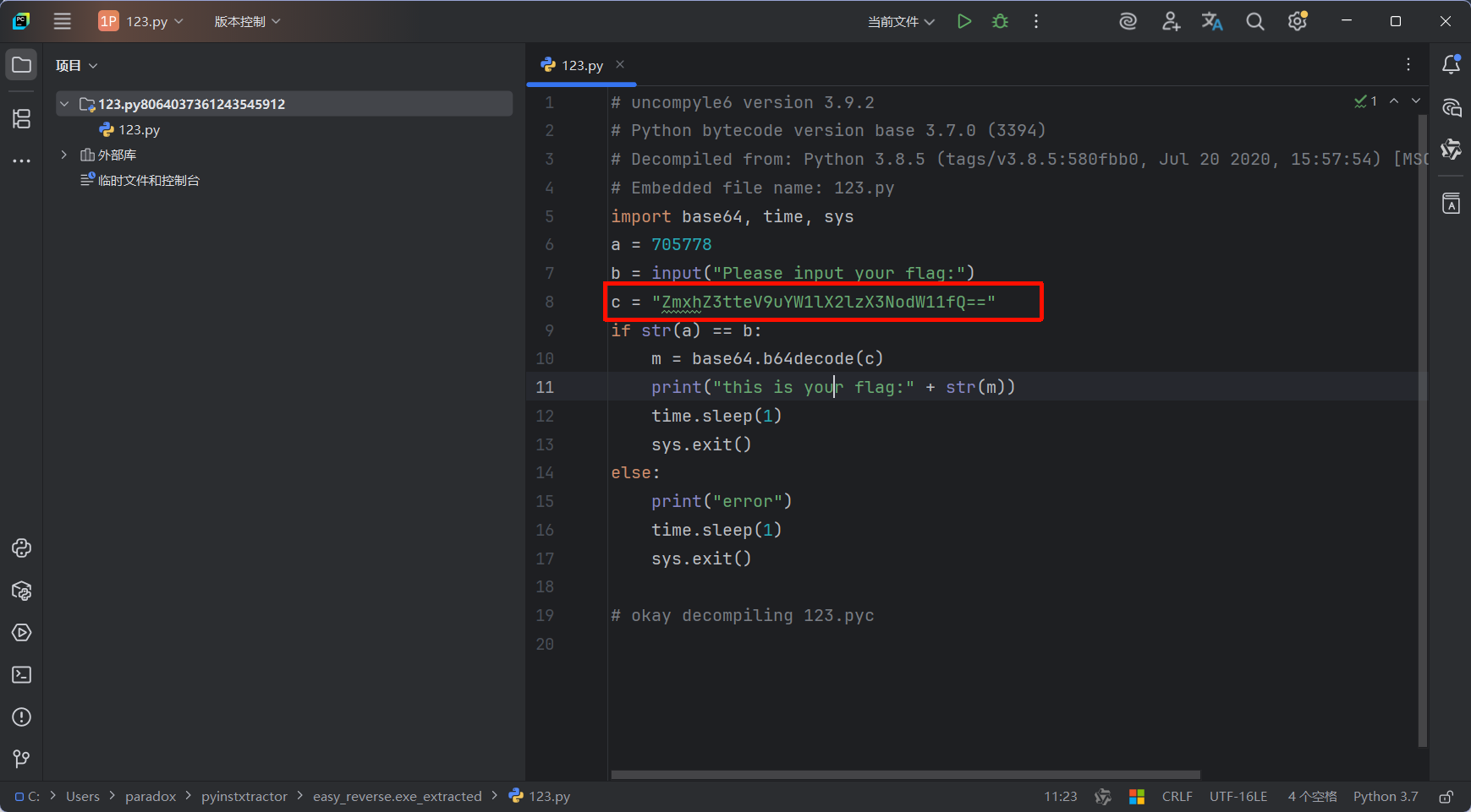 在文件夹中找到123.py打开就可以看到一段 base64 编码编码后的flag