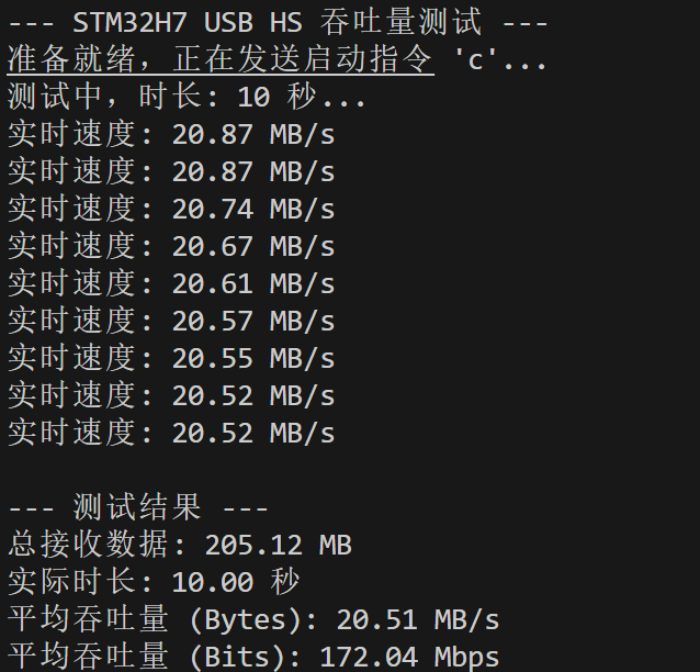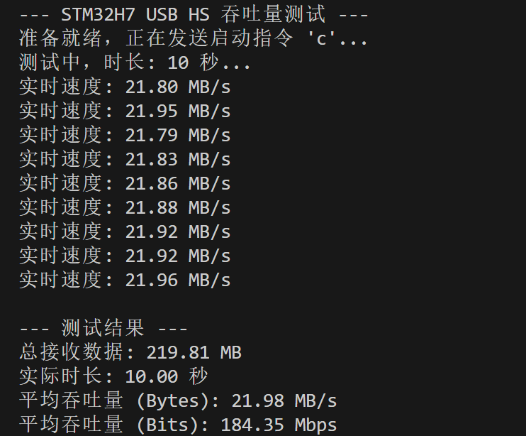 USB_OTG_HS的 FIFO 长度设置,预留出 DMA 寄存器所需的空间。 - 优化结果 :数据发送恢复正常,测速跃升至 22.61 MB/s (I-Cache ON, D-Cache OFF)。这是纯硬件搬运带来的显著增益。