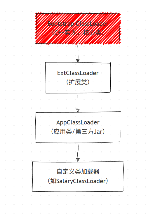 getParent()返回null),加载JAVA_HOME/jre/lib下核心类(如String、Integer)。 - ExtClassLoader(扩展类加载器) :Java 实现(