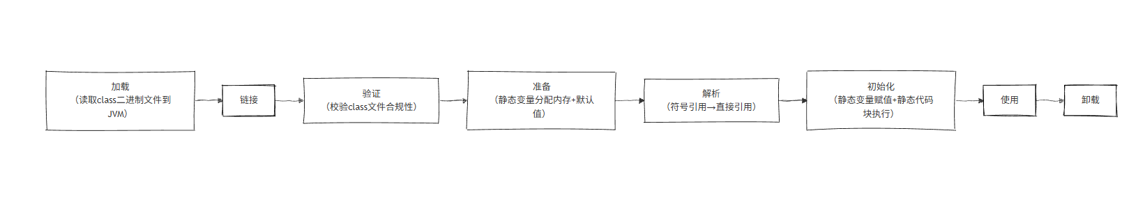 - 完整流程:加载 → 链接(验证→准备→解析)→ 初始化 → 使用 → 卸载